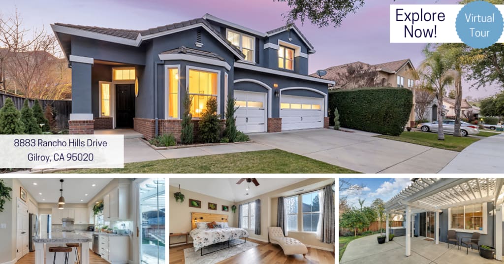 Exquisite single-family home nestled near the hills in a highly desirable Gilroy neighborhood. This spacious 5-bedroom, 3-bathroom home offers 2,516 comfortable square feet of open concept living. Enter through the stately double doors to a sunlit formal living and dining space with soaring two-story ceilings and massive windows. Off the entry is a ground-floor bedroom and bathroom, perfect for an in-law suite. You will love the bright and airy chef’s kitchen featuring a large island, granite counters, stainless steel appliances, a 5-burner gas stove, double wall ovens, and a pantry. Enjoy incredible outdoor living with a pergola covering the rear patio, a new hot tub, and a plethora of bountiful garden offerings.