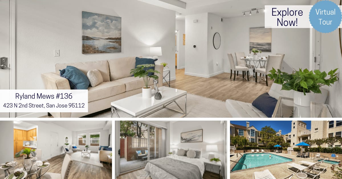 Charming Downtown San Jose condo located at the north end in the highly desirable Ryland Mews community. This one-bedroom, one-bath unit is ideally situated in the community as an end unit with just one shared wall in the kitchen. Spacious, private wrap around patio allows owners to enjoy the outdoors. Enjoy the comforts of central A/C, updated LVP flooring throughout, and an in-unit washer/dryer. Underground secured parking and additional storage cage, a coveted downtown commodity! Fantastic amenities at Ryland Mews include a fitness center, community room, pool, hot tub, and beautifully landscaped courtyard. Great downtown location walking distance to San Jose Marketplace (Target, Marshalls, Panera, Trader Joe's, etc), San Pedro Square, SAP Center, restaurants, entertainment, and more!