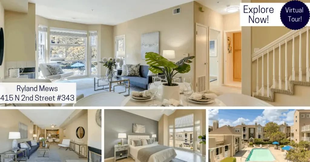 Bright and spacious 3 Bed, 3 Bath home in downtown San Jose with a wonderful open floor plan. You will love this top floor property with views of the pool from the floor to ceiling windows. Full bedroom and bath located on main level with 2 bedrooms and 2 full baths on top level. Enjoy the oversized master suite with wood floors, vaulted ceilings and loads of natural light. You will love the large master closet and master bathroom. This property features a great balcony, dual pane windows, A/C, updated light fixtures, 2 side by side premium parking spaces, and separate storage. Excellent community offering ample guest parking, pool, fitness room, and community room. Ryland Mews is centrally located just minutes from the future Google Campus, Whole Foods, Trader Joe’s, SAP center, public transportation, parks, and downtown restaurants and nightlife!