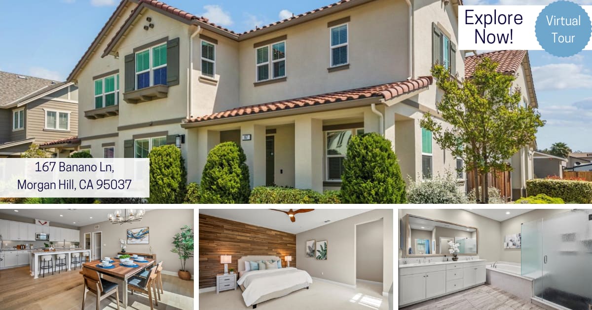 Stunning Solera Ranch 2-story townhome in picturesque Morgan Hill. Spacious 2400+ square foot floorplan with 3 bedrooms, 2.5 bathrooms, and bonus office/den. Solar-powered home. Lots of upgrades and stylish decor features. Large living area with plenty of natural sunlight. Gourmet kitchen with expansive kitchen island, stainless steel appliances, and beautiful countertops. Primary bedroom custom accent panel wall and ceiling fan. Gigantic en suite primary bath featuring soaking tub, separate stall shower, and huge walk-in closet with custom California closet organizers. Two upstairs bedrooms with Jack and Jill bathroom. Private patio off the dining area. Walk-in pantry, laundry room, 2 car garage. Recessed lights, dual pane windows. New carpet upstairs. And right outside your doorstep you have a park with plenty of greenspace, play structure, and barbecue/picnic area! Located just minutes from Downtown Morgan Hill, restaurants, shops, and wineries, Easy freeway access. Low HOA dues.