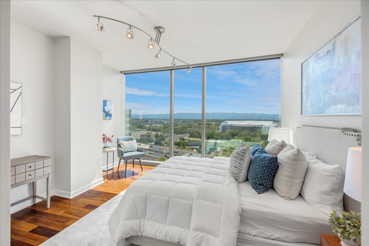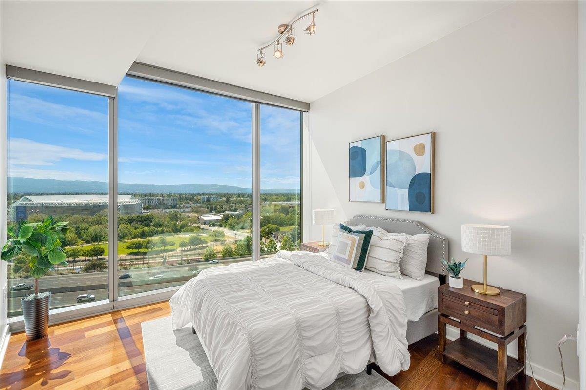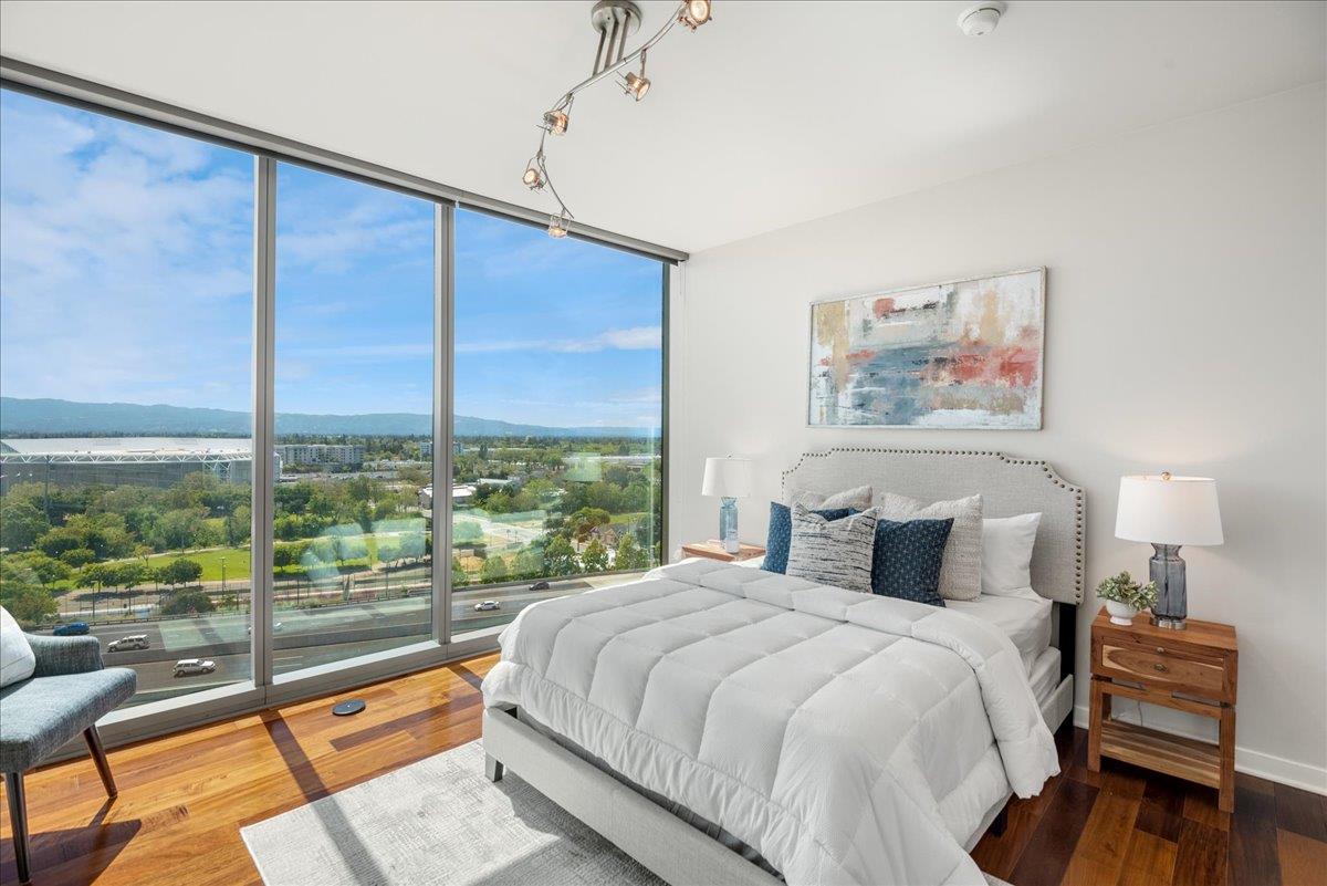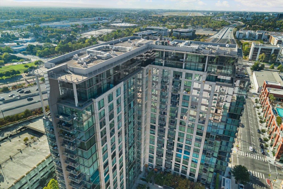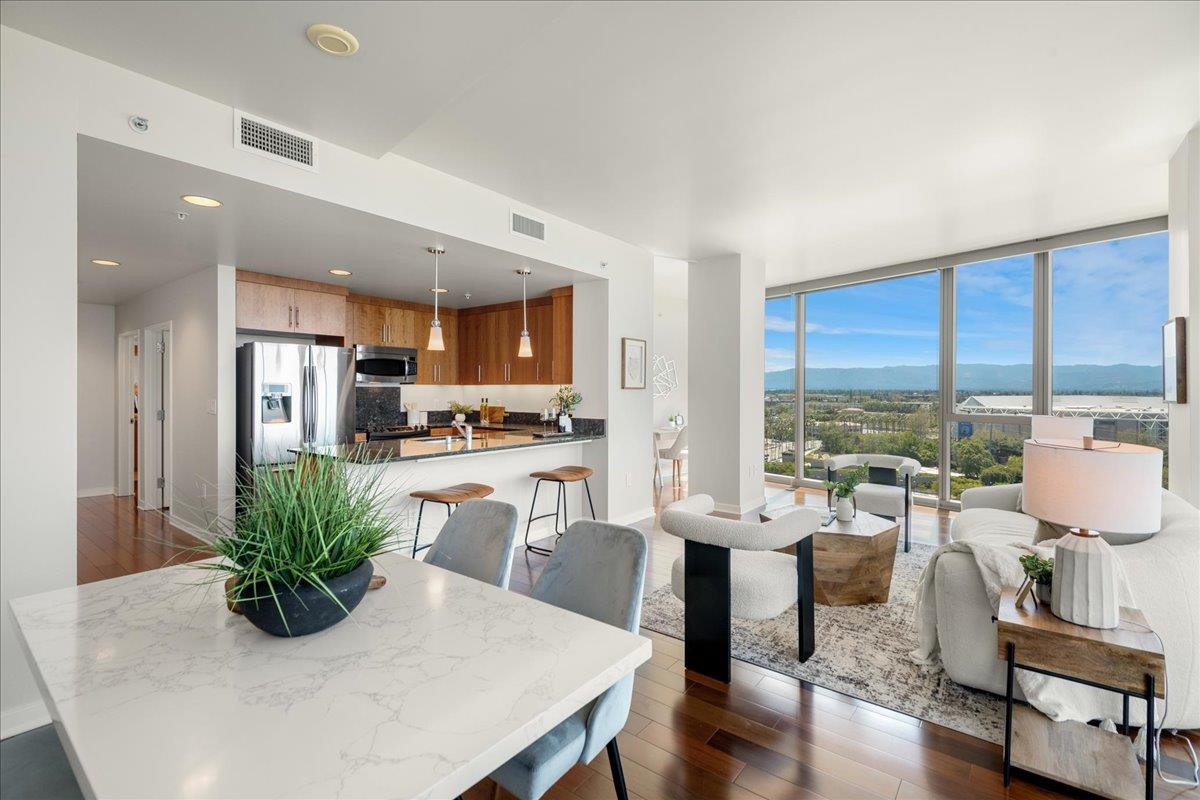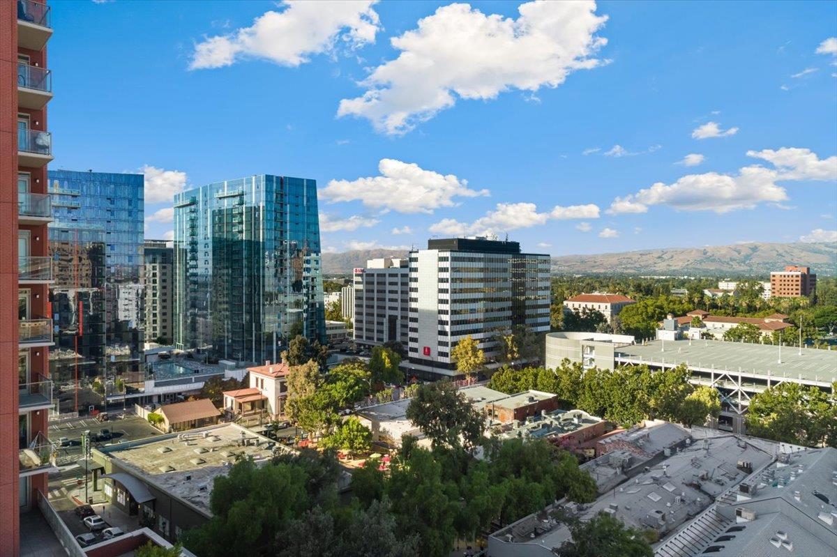 Wonderful 2 bedroom condo in the luxury highrise building Axis in the heart of Downtown San Jose. This is a corner unit property with dramatic floor-to-ceiling windows with spectacular panoramic views of the foothills, SAP Center, and city lights. This corner unit floorplan provides uninterrupted views to the north and to the west. You will not get this kind of view anywhere else! Gourmet kitchen features cherry cabinets, granite counters, and stainless steel appliances. Primary bedroom with walk-in closet and en suite bath. Custom closet organizers. Beautiful hardwood floors throughout. Hotel quality amenities include front desk service, fitness center, entertainment lounge, pool and 2 hot tubs, outdoor kitchen and dining area with commercial grade barbecues, and outdoor fire pit. Centrally located in Downtown San Jose walking distance to SAP Center, San Pedro Square, restaurants, entertainment, and more. Easy access to Highways 87, 280, 880 and nearby to SJ Mineta Airport, Coleman Shopping Center, Whole Foods, and SJSU.