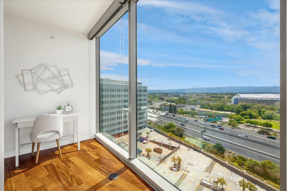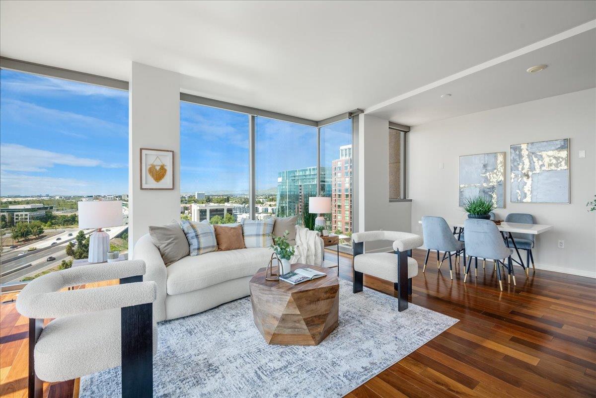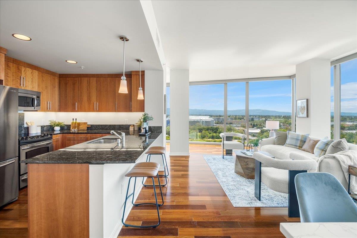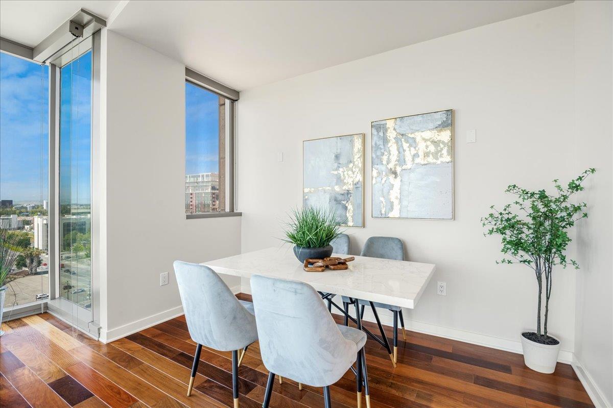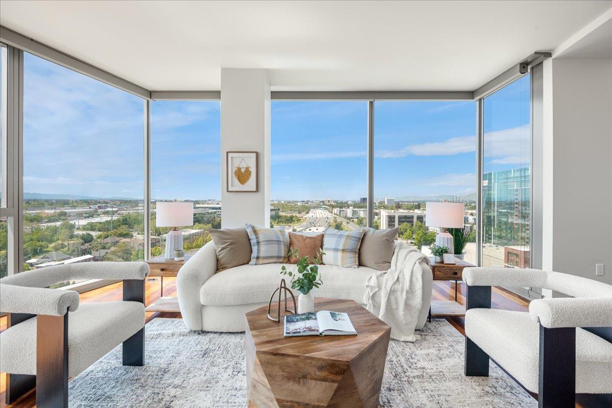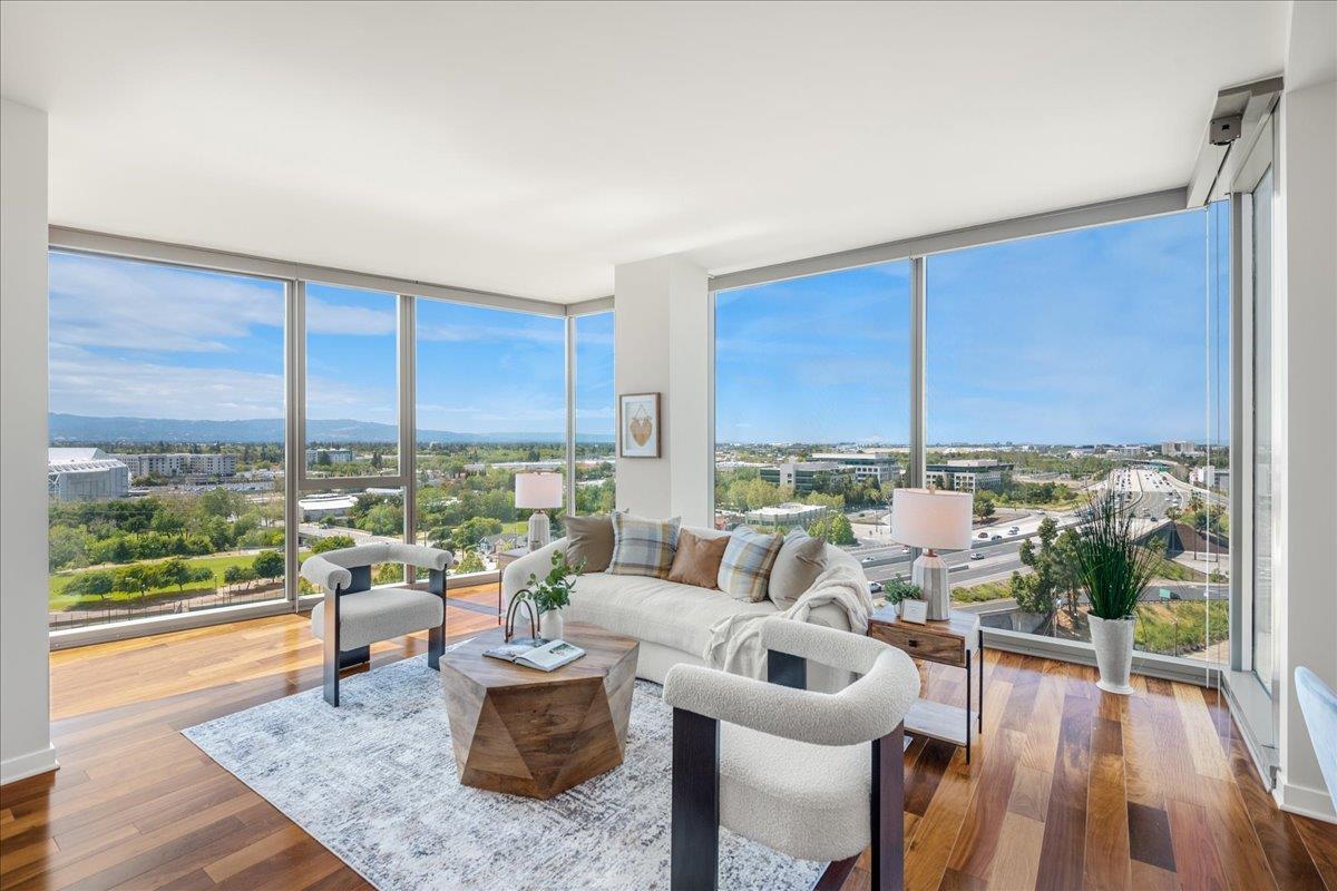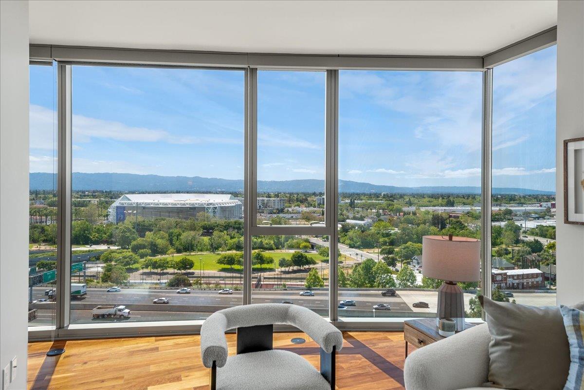 Wonderful 2 bedroom condo in the luxury highrise building Axis in the heart of Downtown San Jose. This is a corner unit property with dramatic floor-to-ceiling windows with spectacular panoramic views of the foothills, SAP Center, and city lights. This corner unit floorplan provides uninterrupted views to the north and to the west. You will not get this kind of view anywhere else! Gourmet kitchen features cherry cabinets, granite counters, and stainless steel appliances. Primary bedroom with walk-in closet and en suite bath. Custom closet organizers. Beautiful hardwood floors throughout. Hotel quality amenities include front desk service, fitness center, entertainment lounge, pool and 2 hot tubs, outdoor kitchen and dining area with commercial grade barbecues, and outdoor fire pit. Centrally located in Downtown San Jose walking distance to SAP Center, San Pedro Square, restaurants, entertainment, and more. Easy access to Highways 87, 280, 880 and nearby to SJ Mineta Airport, Coleman Shopping Center, Whole Foods, and SJSU.