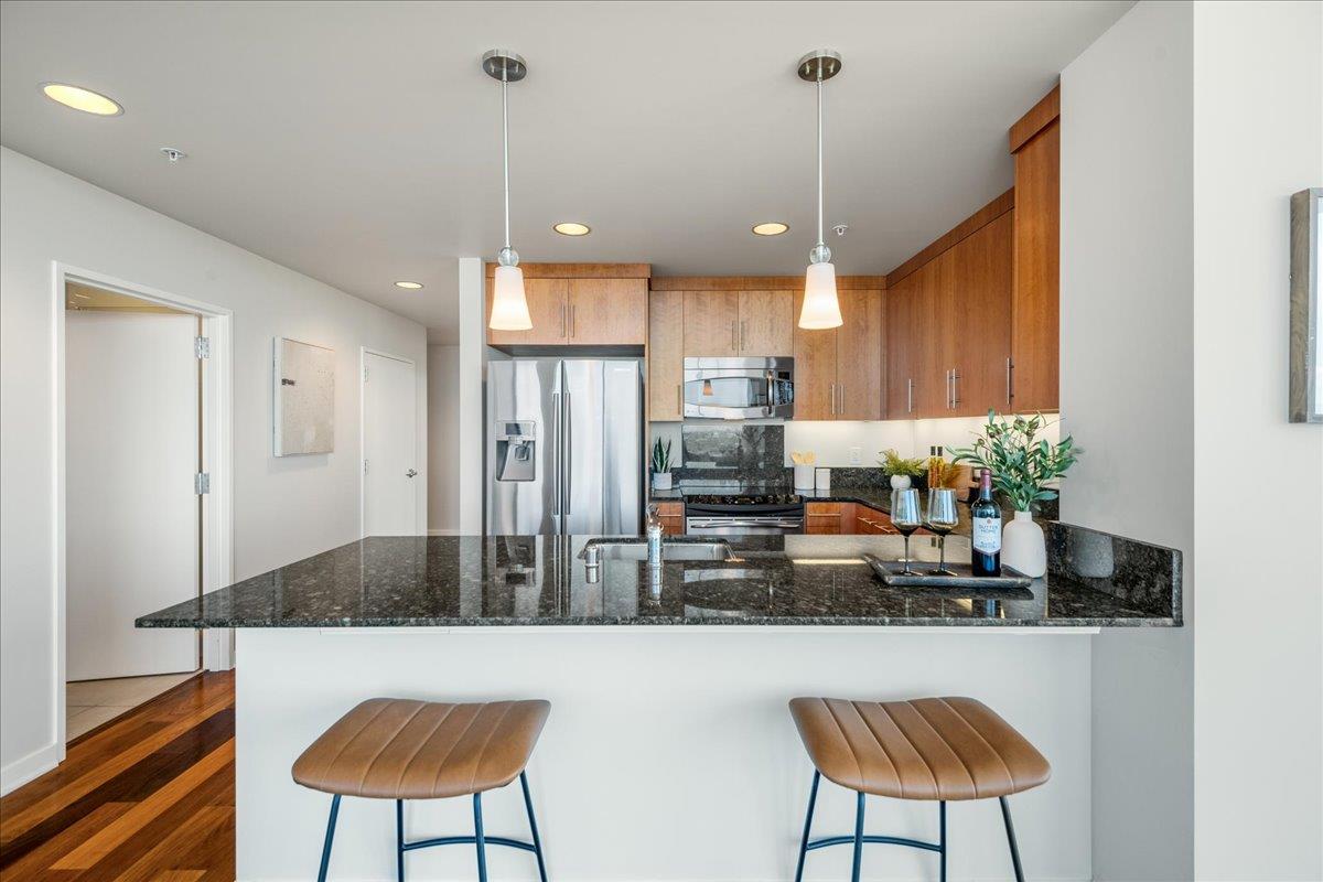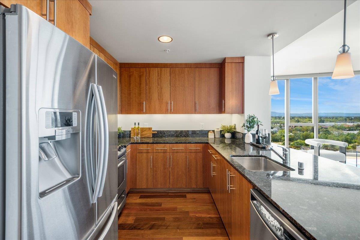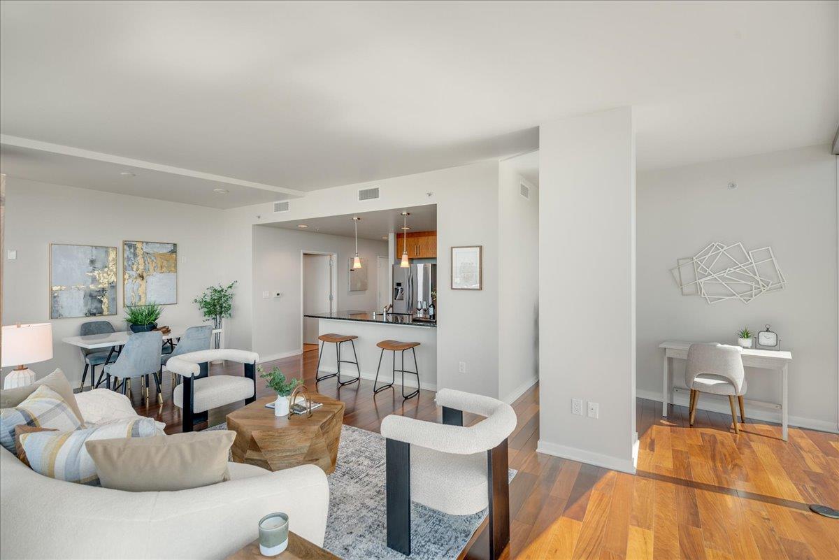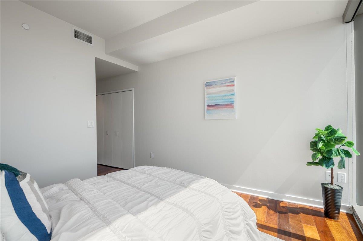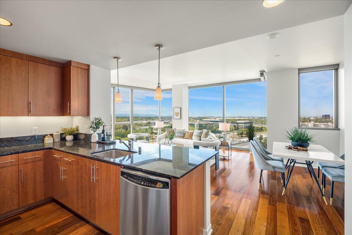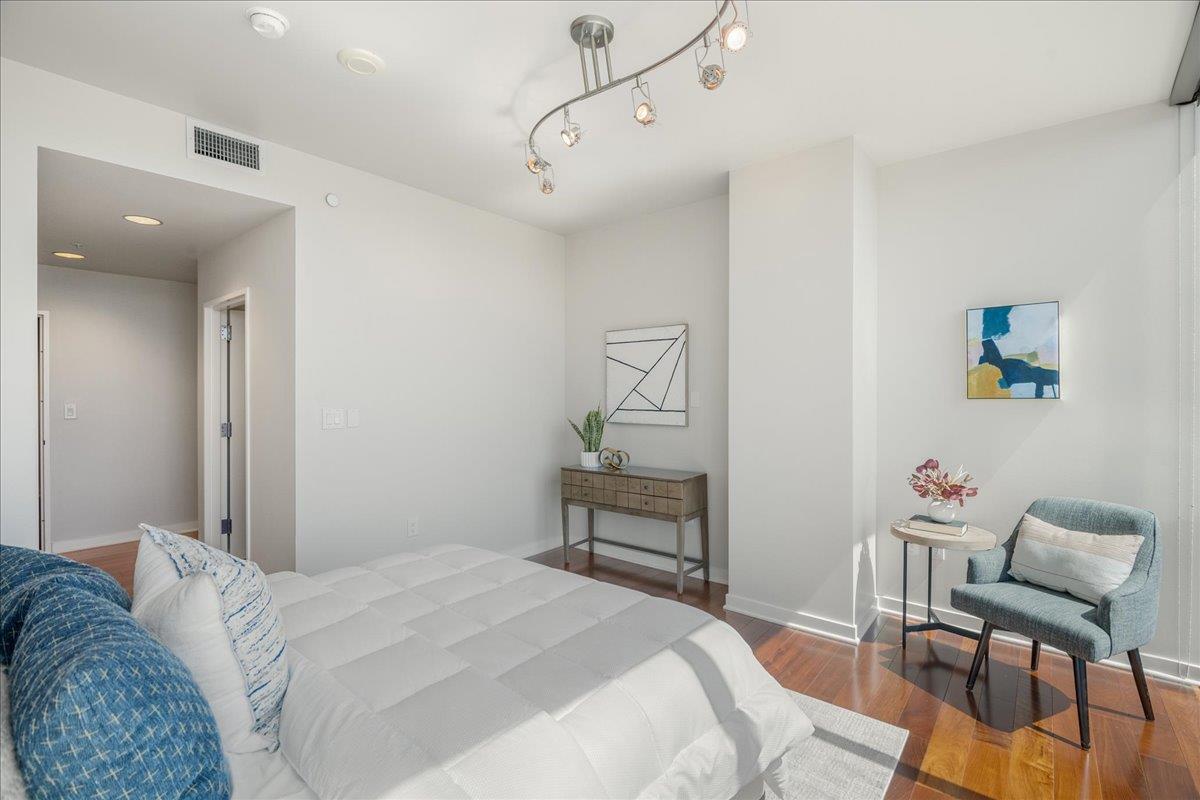 Wonderful 2 bedroom condo in the luxury highrise building Axis in the heart of Downtown San Jose. This is a corner unit property with dramatic floor-to-ceiling windows with spectacular panoramic views of the foothills, SAP Center, and city lights. This corner unit floorplan provides uninterrupted views to the north and to the west. You will not get this kind of view anywhere else! Gourmet kitchen features cherry cabinets, granite counters, and stainless steel appliances. Primary bedroom with walk-in closet and en suite bath. Custom closet organizers. Beautiful hardwood floors throughout. Hotel quality amenities include front desk service, fitness center, entertainment lounge, pool and 2 hot tubs, outdoor kitchen and dining area with commercial grade barbecues, and outdoor fire pit. Centrally located in Downtown San Jose walking distance to SAP Center, San Pedro Square, restaurants, entertainment, and more. Easy access to Highways 87, 280, 880 and nearby to SJ Mineta Airport, Coleman Shopping Center, Whole Foods, and SJSU.